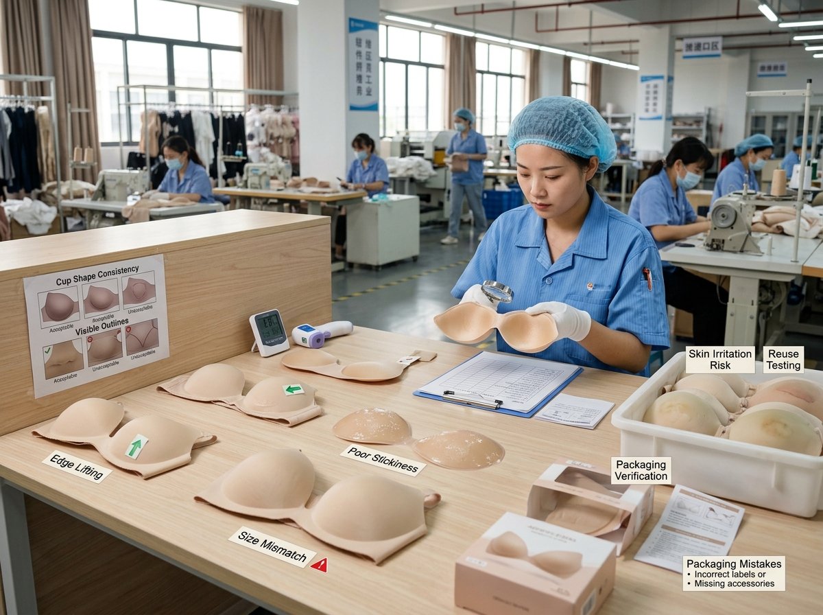 Common adhesive bra defects include poor stickiness, edge lifting, false lift effect, skin irritation, size mismatch, visible outlines, short reuse life, and packaging mistakes.