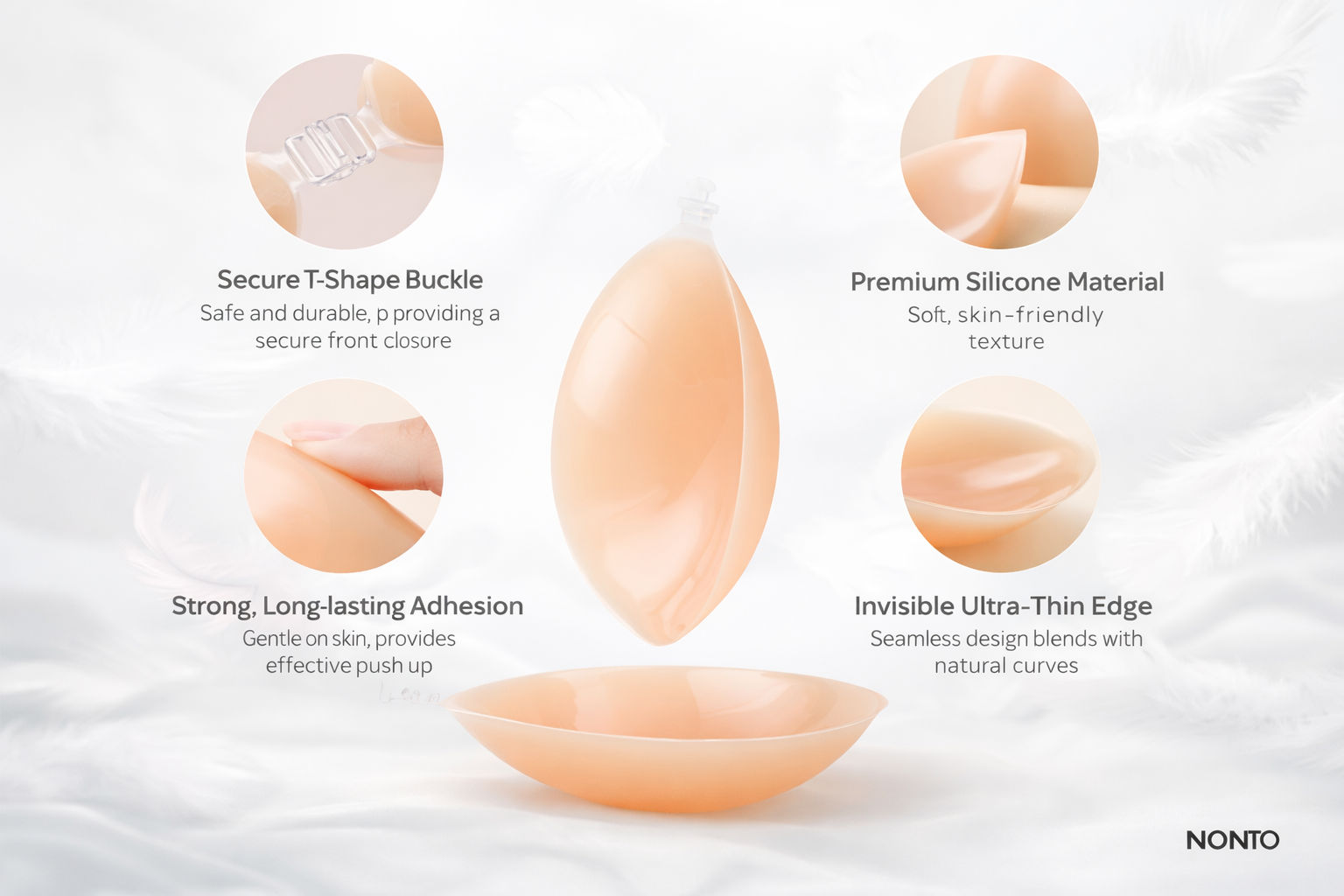 Silicone bras typically use skin-safe, pressure-sensitive adhesives engineered to bond with clean skin through body heat, offering secure hold while allowing gentle removal and reuse.